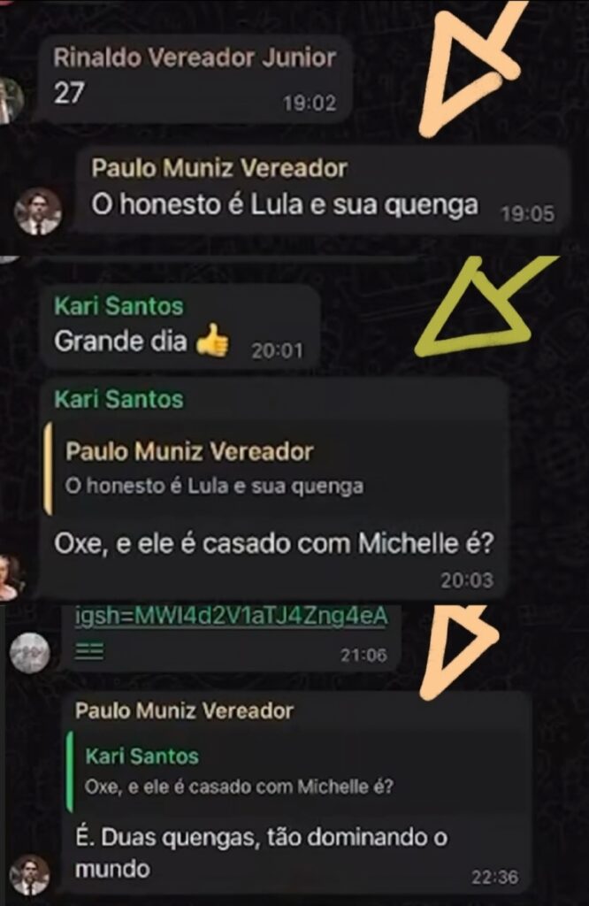 Em suposta resposta às mensagens, Muniz teria escrito: “Honesto é Lula e sua quenga”, aparentemente referindo-se à primeira-dama Janja. A vereadora Kari Santos (PT) reagiu, perguntando se Lula seria casado com Michelle. Em seguida, o parlamentar do PL teria replicado: “É. Duas quengas, tão dominando o mundo”.